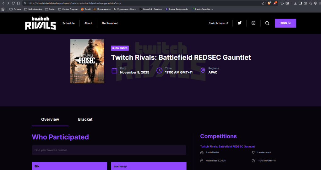 Here is the link page showcasing participation with 31 other ANZ content creators selected by EA to take part in the Battlefield 6 Gauntlet Twitch Rivals.
